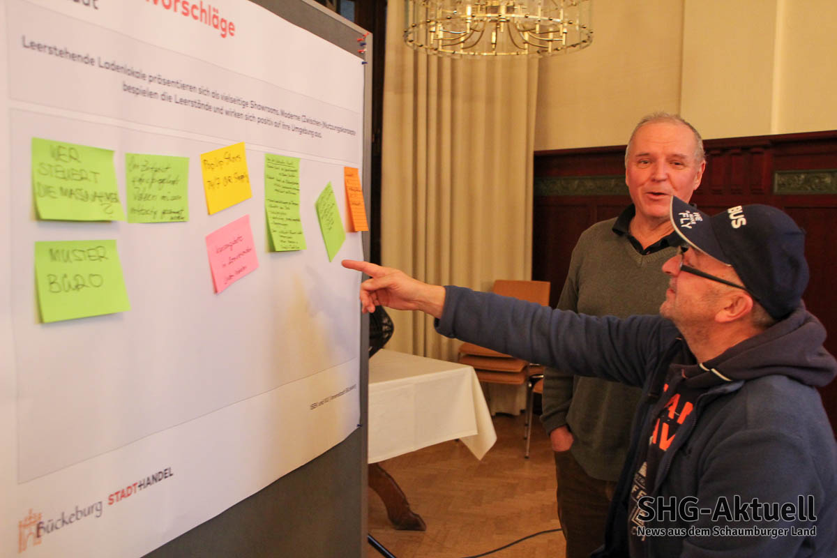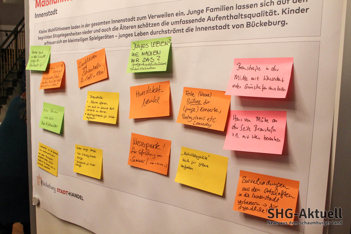 Eine feste Bühne auf dem Marktplatz soll für mehr Kunst und Kultur genutzt werden. Mehr Fahrradfreundlichkeit wurde gefördert, auch nachhaltige Fortbewegungsmöglichkeiten wie Fahrradtaxis wurden vorgeschlagen. Die Tradition Bückeburgs könne als Alleinstellungsmerkmal vermarktet werden. Zudem komme die Stadt nicht um mehr Grün und Sitzmöglichkeiten herum. „Wenn wir uns auf Blumentöpfe und Spielgeräte konzentrieren, haben wir unser Ziel verfehlt“, prangert Andreas Frenzel-Rückert an. „Wir müssen uns interessant machen, so bringen wir Leben in die Stadt“, dies müsse in den Bereichen Wohnen, Gastro, Handel und Arbeiten passieren. Zudem müssten diese weiteren Schritte extern begleitet werden, da die Bürger als Akteure betriebsblind für ihre Stadt seien.