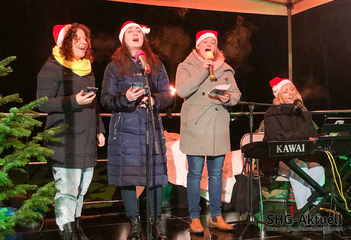 Sängerin Katharina Kühn unterstützte die Sänger als Leadstimme von der Bühne aus. Nach „Macht hoch die Tür“, „Es ist ein Ross entsprungen“ und „Lasst uns froh und munter sein“ kam passend, jedoch mit etwas Verspätung, der Nikolaus vorbei und verteilte kleine Leckereien und Äpfel an die Kinder. Besonderes Highlight war das gemeinsam gesungene „Stille Nacht“ – auf ukrainisch, mithilfe dreier geflüchteter Frauen aus Charkiw, auf englisch und deutsch.