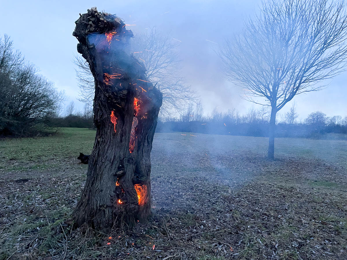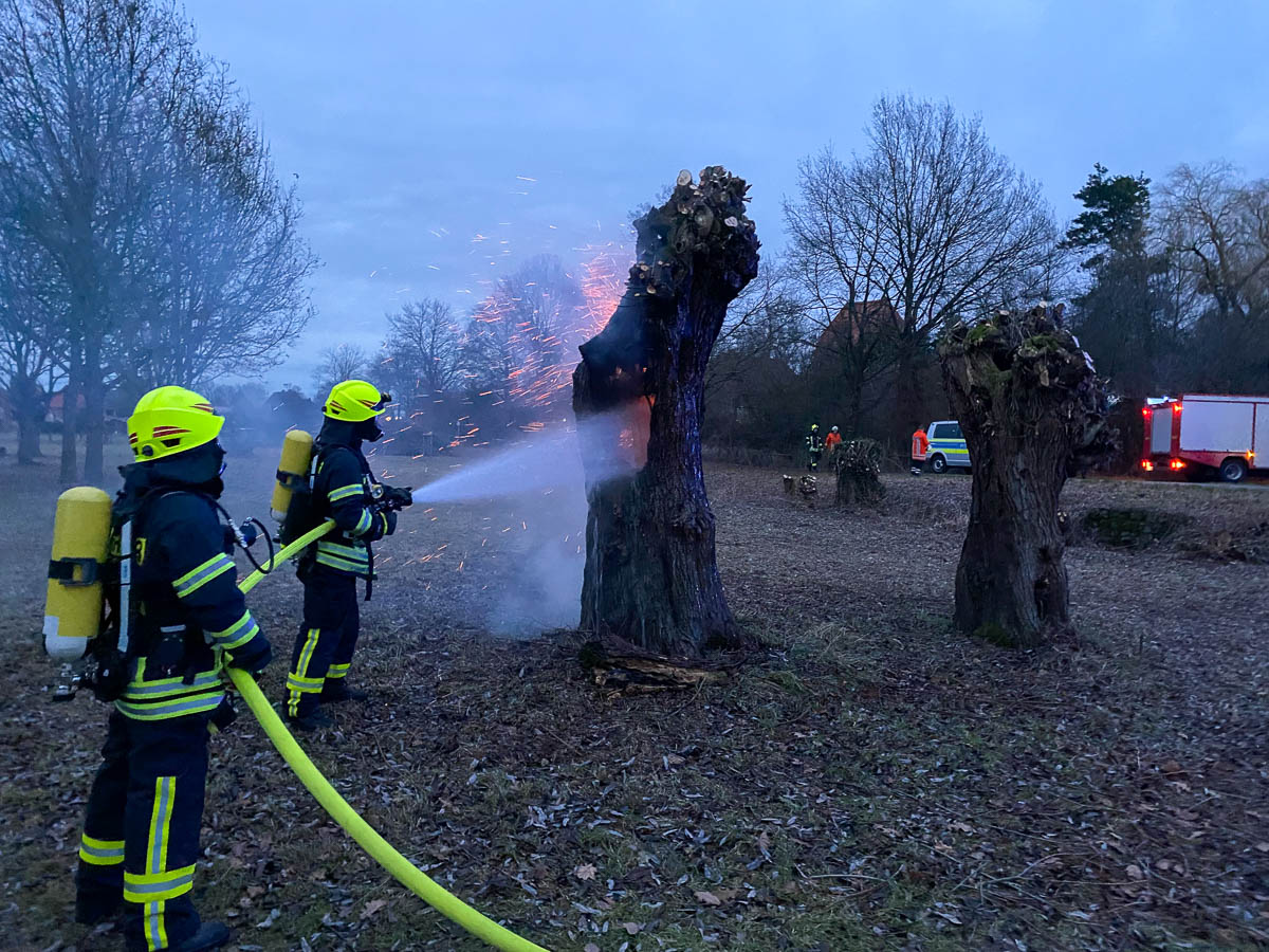 Dort hatte ein Baum auf einer Wiese Feuer gefangen. Die Feuerwehren löschten diesen unter Atemschutz ab und überprüften die Brandstelle noch mit einer Wärmebildkamera.