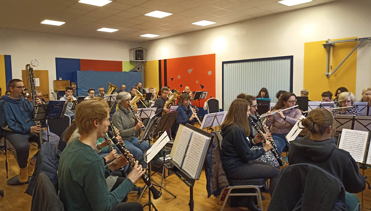 Um nach dem Jahreskonzert so kurzfristig wieder ein neues Programm auf die Beine stellen zu können, trafen sich 44 Musiker des BOK zuvor zu einem Probentag um aus den vielen einzelnen Registern einen harmonischen Gesamtklang zu erzeugen. Der Probentag verlief wie gewohnt recht diszipliniert und Roman Reckling ließ es sich nicht nehmen, an der einen oder anderen Stelle so lange herumzufeilen bis sie saß. „Der Übergang ist noch nicht ganz sauber – noch einmal“, forderte der Dirigent die Musiker zu noch mehr Genauigkeit auf.