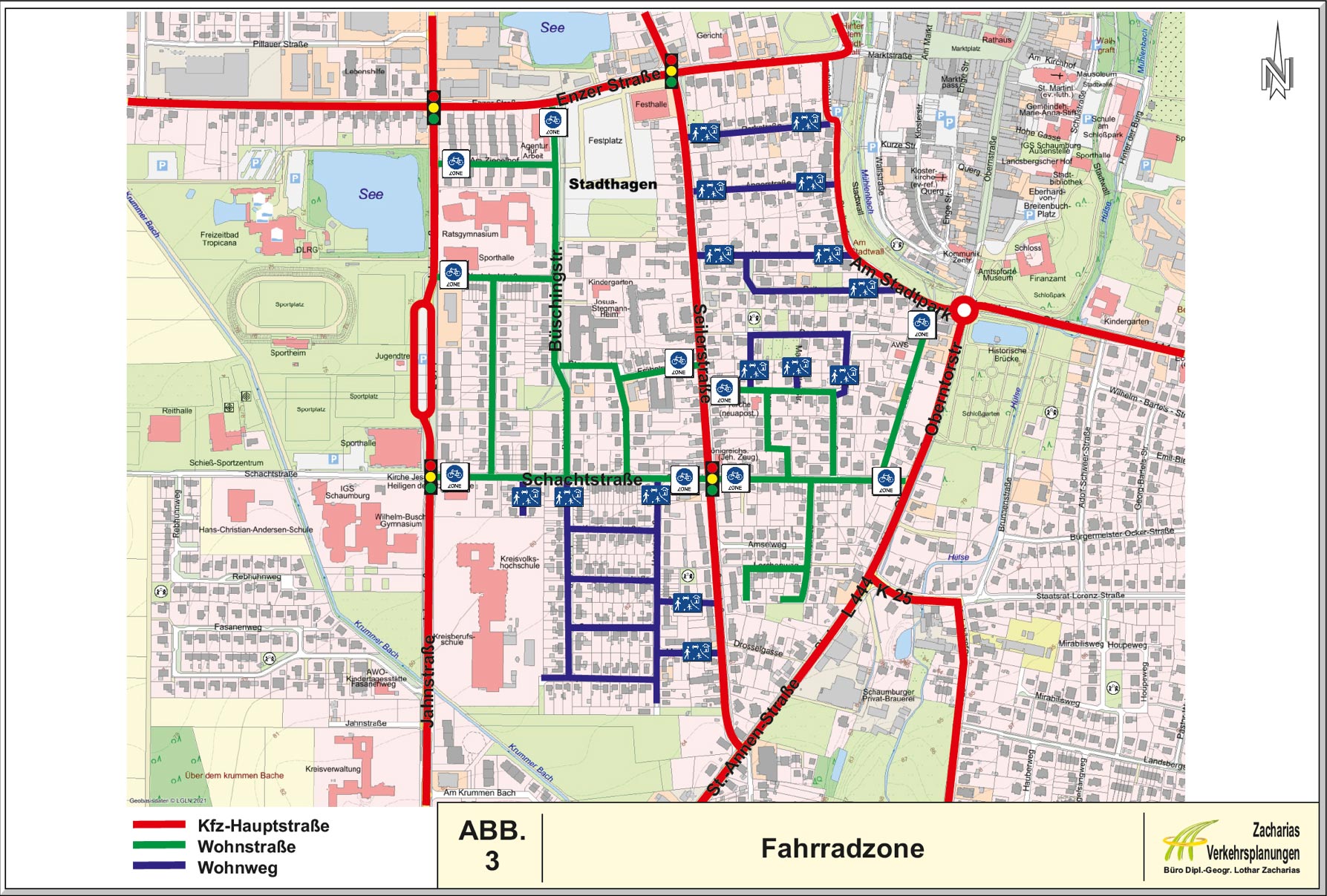 Die Schachtstraße soll im Abschnitt „Oberntorstraße – Jahnstraße“ als Fahrradzone ausgewiesen werden. Zur Fahrradzone zählen auch die von der Schachtstraße abzweigenden Straßen, die keine verkehrsberuhigten Bereiche sind. Hierzu zählen östlich der Seilerstraße die Obere Wallstraße, Wiegmannstraße, Wilhelm-Busch-Straße, Magister-Koller-Straße, Finkenstraße, der Amselweg und Lerchenweg sowie westlich der Seilerstraße die Stegmannstraße, Fröbelstraße, Büschingstraße, Wietersheimstraße, Westphalstraße und die Straße Am Ziegelhof. Geplant ist in einem ersten Schritt das Aufstellen von entsprechenden Verkehrsschildern sowie das Anbringen von Fahrbahnmarkierungen. In einem zweiten Schritt sind auch Umbaumaßnahmen möglich.