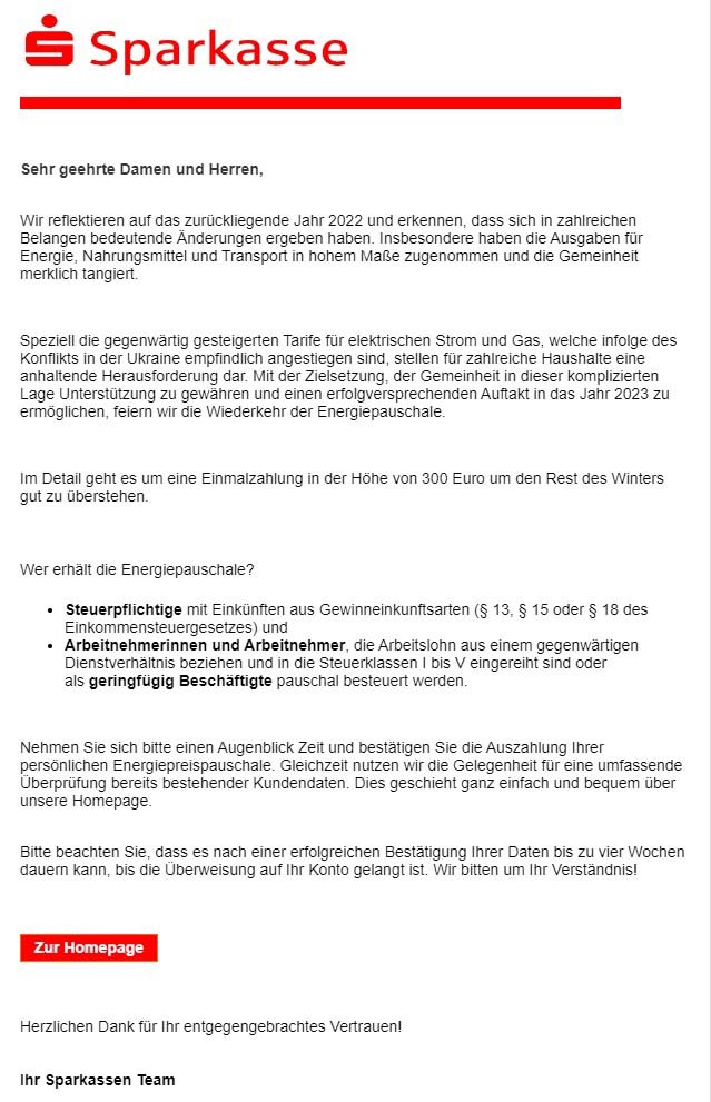 Kriminelle behaupten in diesen Mails, man könne eine weitere Energiepauschale erhalten. Dafür müsse man die eigenen Kundendaten auf der verlinkten Homepage prüfen.