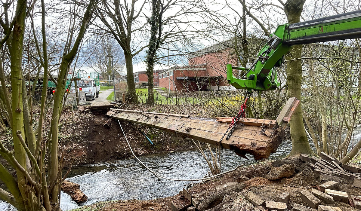 Mitarbeiter des Bauhofs in Bückeburg haben mit schwerem Gerät die fast 40 Jahre alten Bongossi-Holzbrücken nun abgerissen und die Vorbereitungen für weitere Maßnahmen eingeläutet und somit der Stadtkasse Geld eingespart.