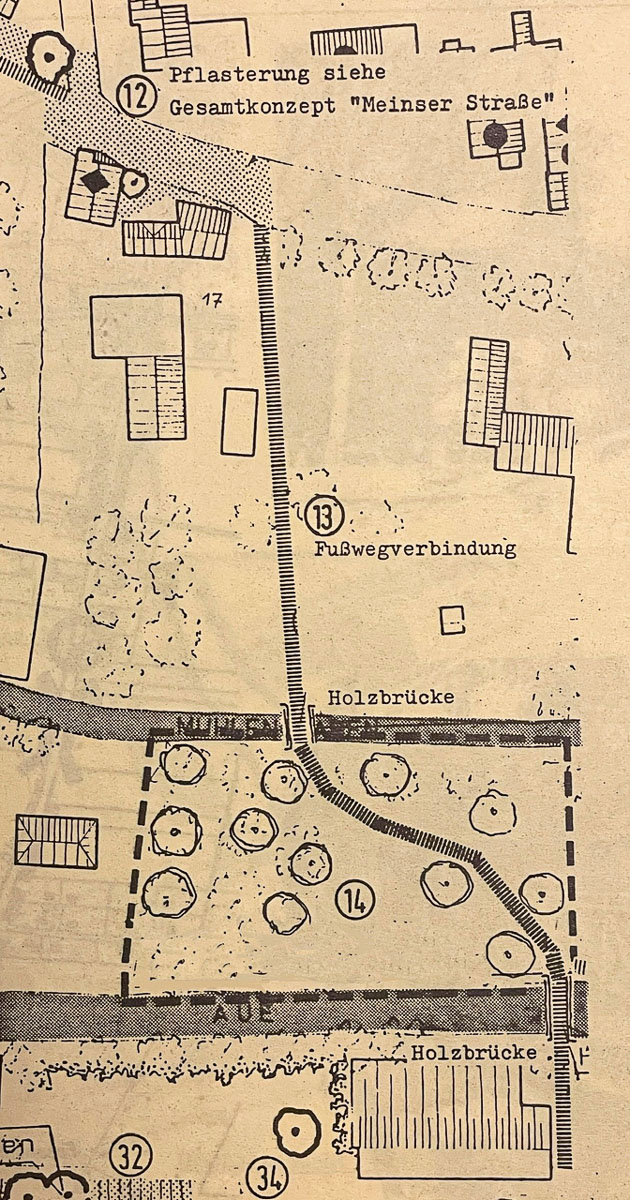 Die Verkehrssicherheitspflicht war nicht mehr gegeben und die Statiker haben eine weitere Nutzung im Gutachten in Frage gestellt. Absicht der Verwaltung ist es, die ehemalige Brücke nur über die Aue durch eine Stahlbrücke im zweiten Halbjahr dieses Jahres zu ersetzen und den Verbindungsweg wieder öffnen.Das Holz, so Ortsbürgermeister Andreas Paul Schöniger, ist aber nicht verloren und soll als „Lernort Natur“ als Unterbau einer kleinen Bühne weitergenutzt werden.