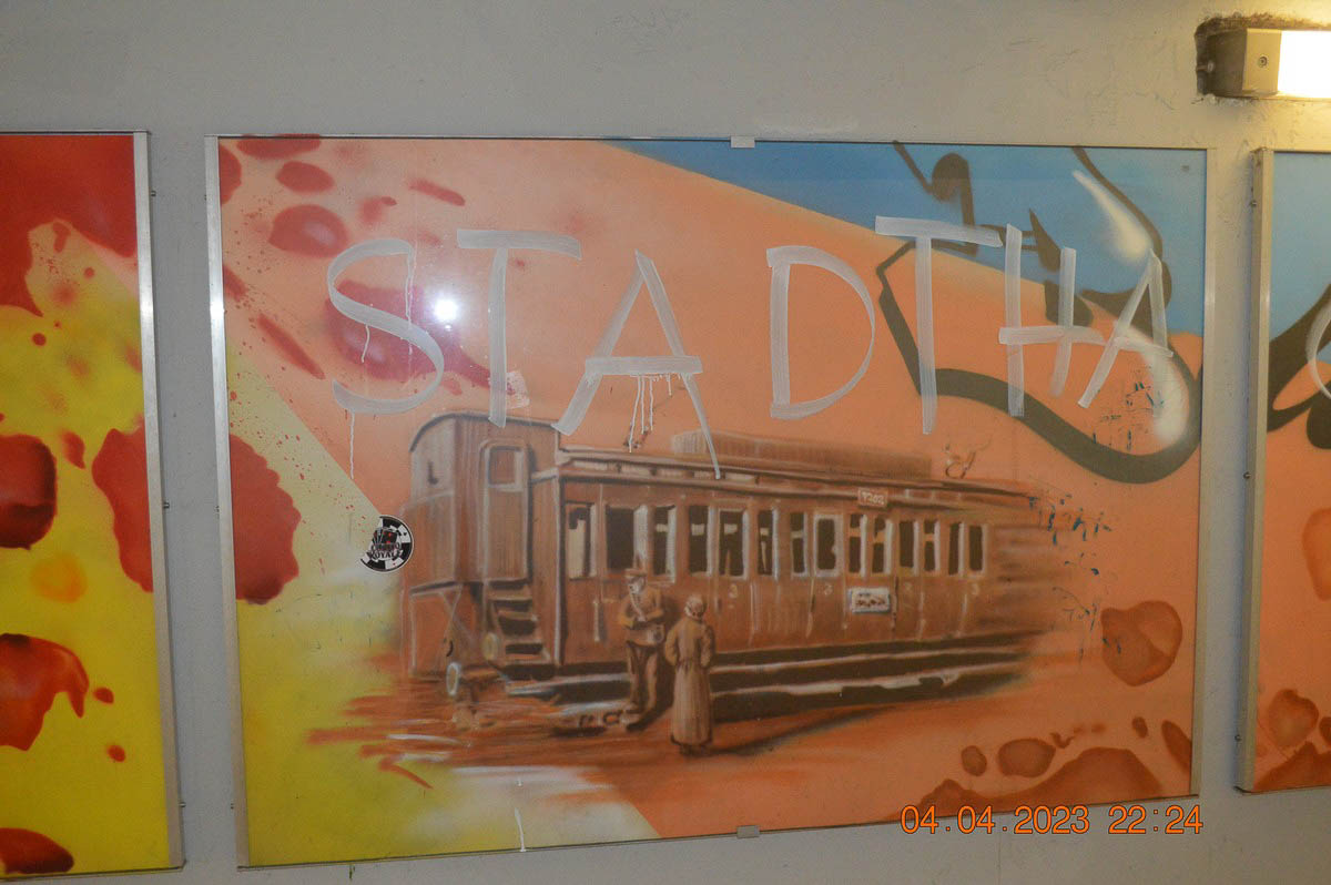 (Bückeburg) In der Unterführung des Bückeburger Bahnhofs sind die dort angebrachten sieben Graffiti-Bilder von bislang unbekannter Tätern mit Schriftzügen und grau-weißer Farbe beschmiert worden.