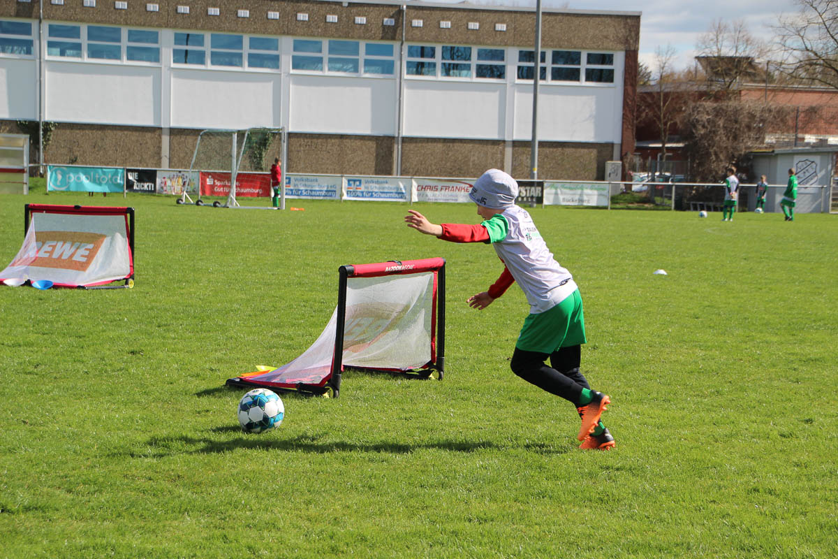 „Gerade die Jugend und den Sport, direkt bei uns vor Ort, unterstützten wir sehr gerne“, bestätigte auch Alexander Zuschlag, Regionalleiter Bückeburg der Volksbank in Schaumburg und Nienburg. Für die Kinder drehte sich wiederum vier Tage lang alles um Fußball. Auf dem Programm standen für die Teilnehmer zahlreiche Trainingseinheiten mit Stations- und Torwarttraining, Dribbling und dem Torschussspiel. Seit Jahren zählen dazu auch soft Skills wie das Fairplay und Teamwork. Das achtköpfige Trainerteam kümmerte sich dabei wieder umfassend um die motivierte Meute. Und dass das bei den Kinder gut ankommt, zeigt sich an den zahlreichen Wiederholungstätern. „Wer hat denn schon mal von euch bei unserer Fußballschule mitgemacht“, fragte Wolf die Fußballkids, und sofort schnellten rund die Hälfte der Hände nach oben.