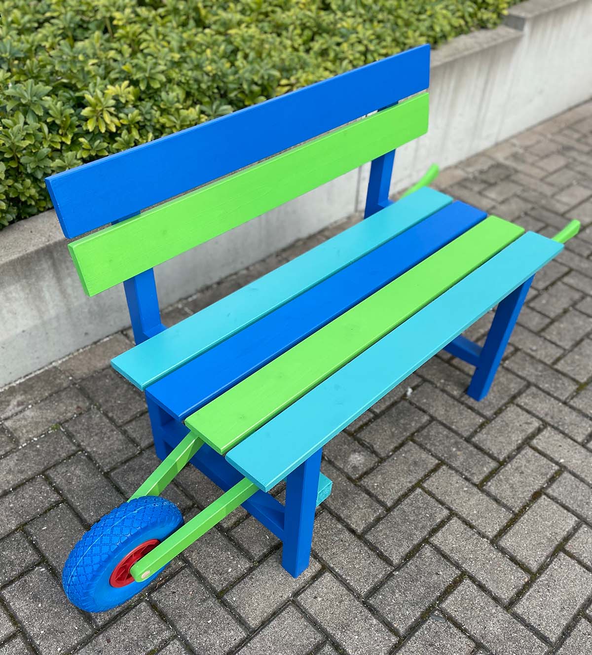 Genau das soll die mobile Bank sein: Ein Hingucker, der aufmerksam macht. Die kleine Gartenbank mit Vorderrad, die an eine Schubkarre erinnert, ist eine handgefertigte Sonderanfertigung in den Farben der Landeskirche.