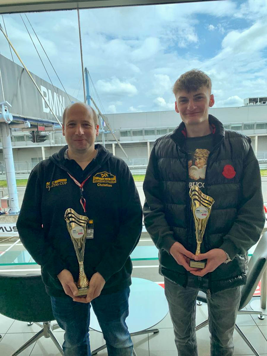 Bis zum Nürburgring zur Siegerehrung ging es Sonnabend für die Fahrer des ADAC Digital Cups der Wintersaison. Teamchef Christian Greth und Fahrer Luc Maddox Neuleuf (Nico Beyer war leider verhindert) wurden für den dritten Platz in der GT3 Wertung und Platz eins der Jugendwertung mit zwei Pokalen geehrt. Marc Hennerici vom Organisationsteams des Digital Cups war sehr erfreut, dass die Familien Greth und Neuleuf/Stranz den weiten Weg gemacht haben, um dabei zu sein. Auf dem Nürburgring gab es noch das 6-Stunden-Qualifikationrennen für das kommende 24-Stunden-Rennen mit realen Rennwagen zu bestaunen, was noch ein zusätzliches Highlight des Tages darstellte. (pr/Fotos: SMC)
