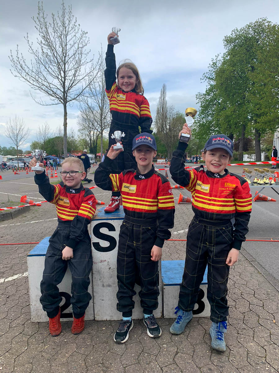 Frühstarter war wieder Timo Greth (K5), der Sechster von elf Fahrern wurde. Etwas unglücklich war er über seine drei Pylonenfehler, aber es machten recht viele der Klasse Fehler. Das „Z“ und der Grip der Pflasterung bereitete Probleme, aber nachdem diese Auffälligkeit dann von den K5-Piloten an die nachfolgend startende K4 berichtet wurde, lief es bei ihnen etwas besser. Und besonders gut für Chris Rädke vom SMC, der auf Rang drei der 27 Starter kam. Er hatte auch einen Pylonenfehler. Wäre dieser nicht gewesen, hätte er dank der schnellen Rundenzeiten sogar gesiegt. „Die Sorgen machten eigentlich das „Z“, aber dann war es doch eine umgestürzte Pylone in der „Brezel“-Einfahrt“, sagte Vater Jens nach den Fahrten seines Sohnes, „wir sind aber auch so stolz und froh und glücklich.“
