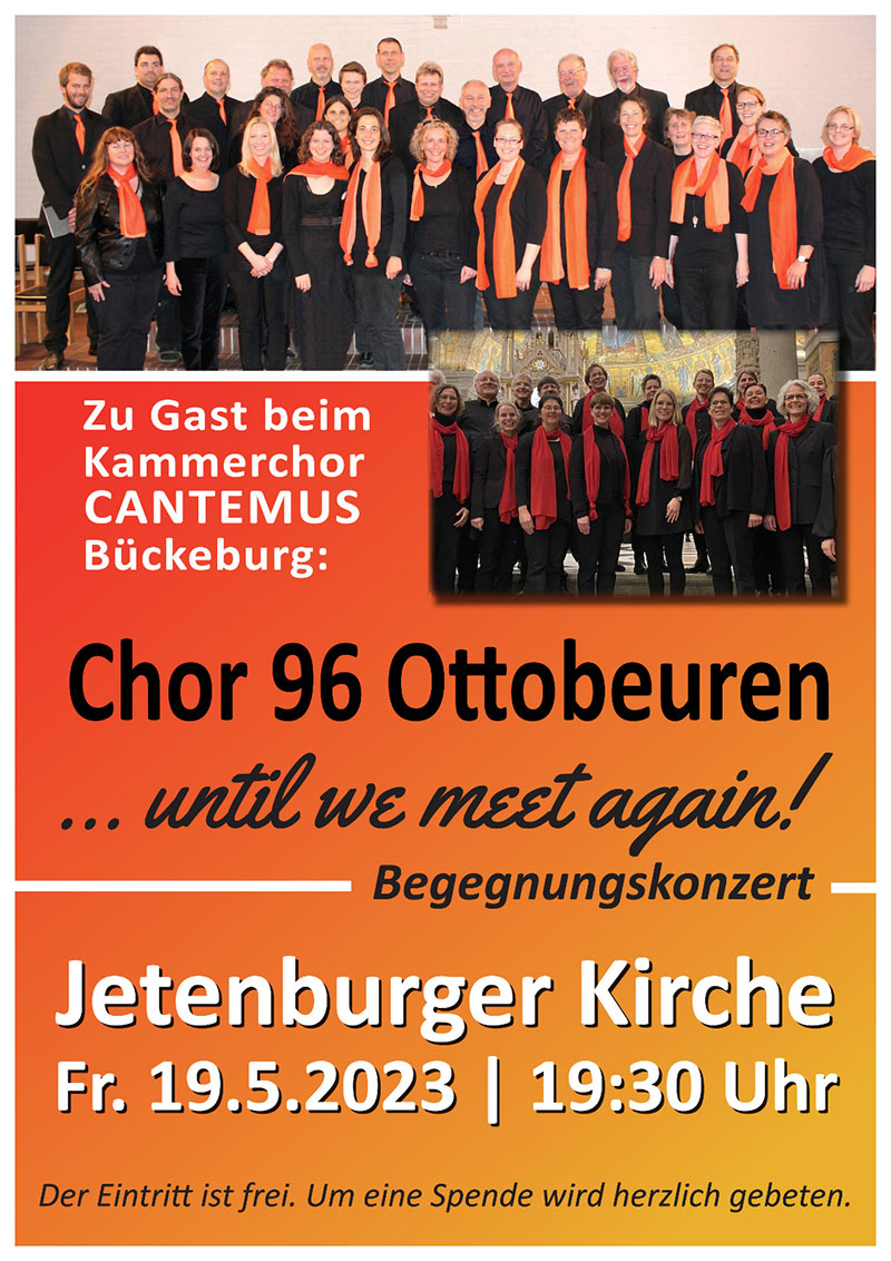 Der „Chor 96“ aus Ottobeuren im Allgäu freut sich auf schöne Tage in der ehemaligen Residenzstadt Bückeburg. Auf dem Programm steht neben vielen gemeinsamen Unternehmungen in Bückeburg und Umgebung auch ein Konzert beider Chöre in der Jetenburger Kirche in Bückeburg am 19. Mai um 19:30 Uhr.