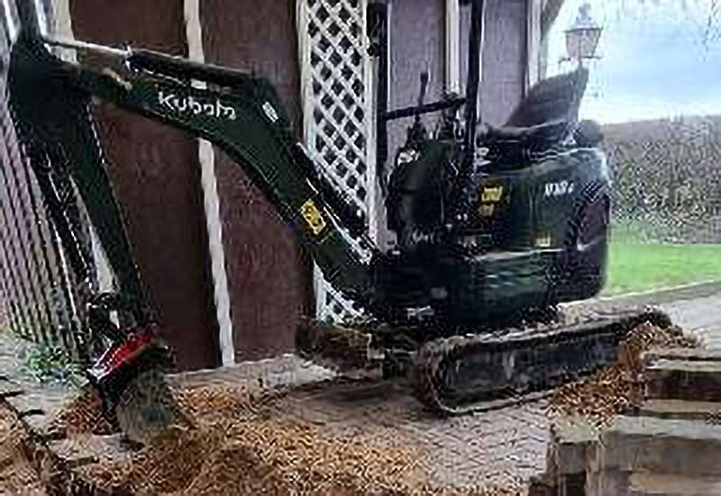Der Kubota-Minibagger hat hohes Wiedererkennungspotential. Entgegen der normalen orangenen Farbe wurde dieser in „Tannengrün glänzend“ lackiert. Der Anhänger mit offener Ladefläche und hochklappbarer Auffahrrampe ist silber und vom Hersteller „Temared“.