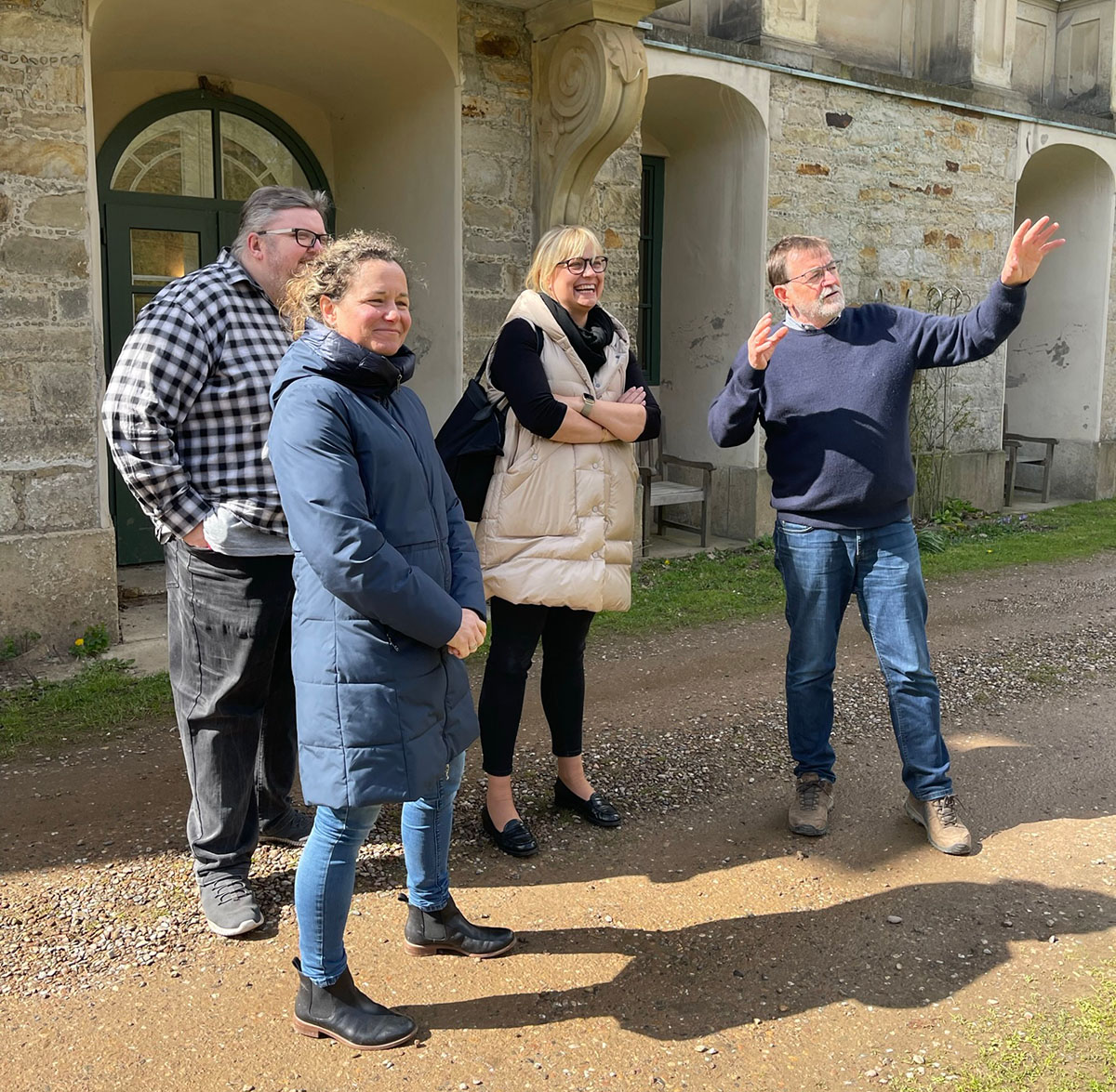 Gemeinsam mit der Vorsitzenden des Trägervereins „Schloss Baum e.V.“ Birthe Kruska, Vorstandsmitglied Aleksej Heinz sowie Hauswirt Klaus Harms startete der Besuch mit einem Rundgang durch die Seitengebäude über das idyllische Gelände bis hin zu dem architektonisch eindrucksvollen Haupthaus aus dem 18. Jahrhundert.