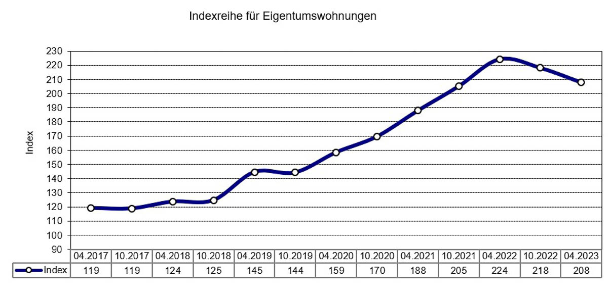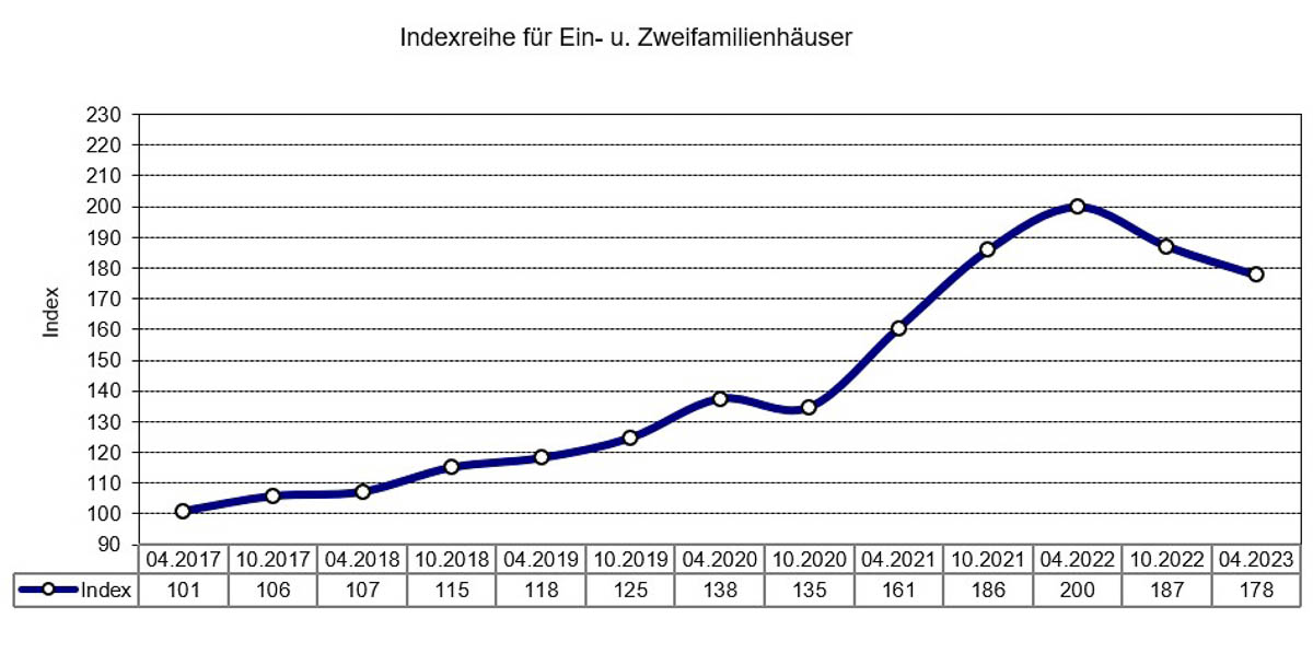 Aktuelle Auswertungen im April 2023 lassen erkennen, dass das hohe Niveau der Immobilienpreise zum 2. Halbjahr 2022 zu sinken begann. Die beiden folgenden Grafiken über die Indexreihe für freistehende Ein- und Zweifamilienhäuser und für Eigentumswohnungen machen den Preisknick Mitte 2022 deutlich: