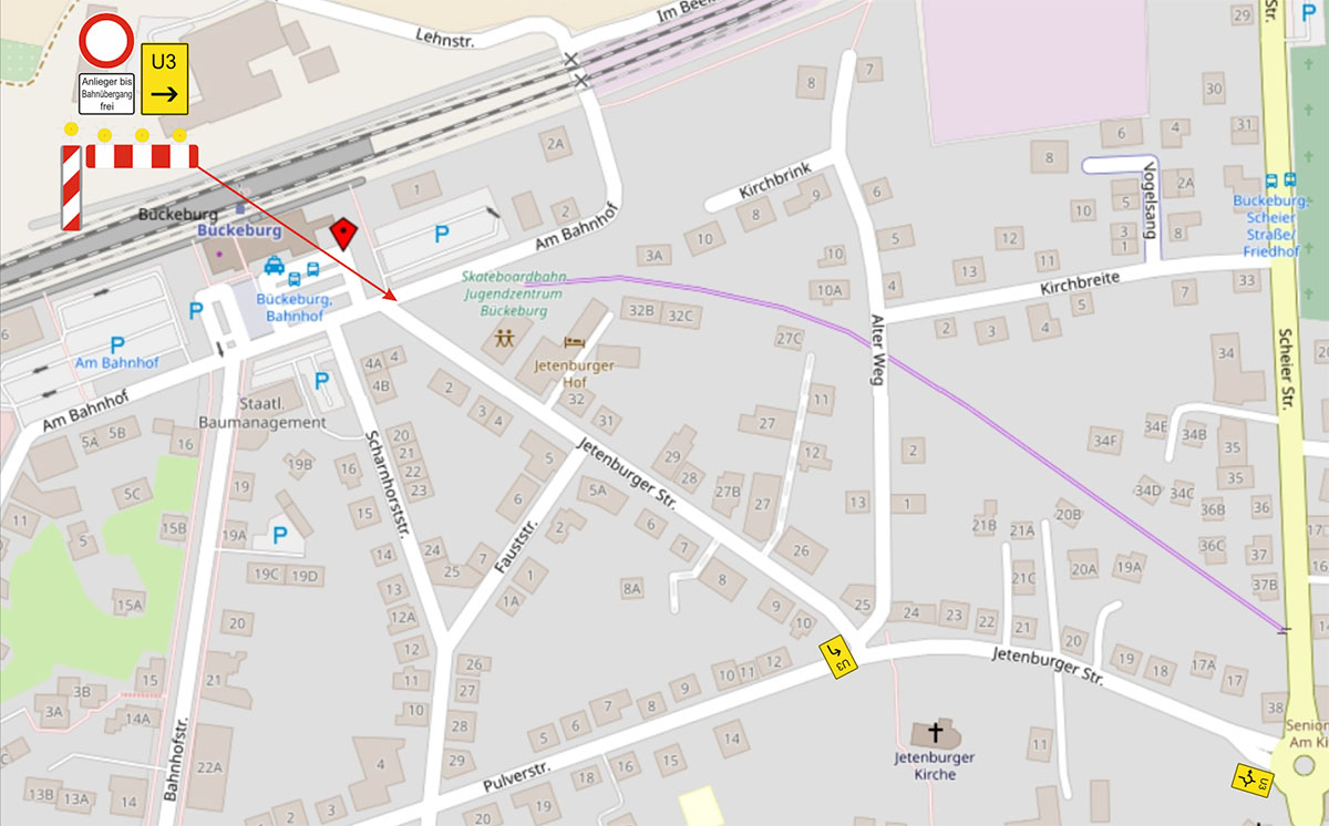 Die Sperrung kann entsprechend über die Strecke „Am Bahnhof – Jetenburger Straße – Scheier Straße – Hauptstraße – Jagdweg“ umfahren werden.