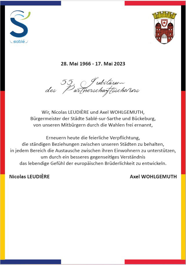(Bückeburg) Die Städtepartnerschaft zwischen der Stadt Bückeburg und der französischen Stadt Sablé-sur-Sarthe wurde am 28.5.1966 gegründet und besteht nunmehr seit 57 Jahren.