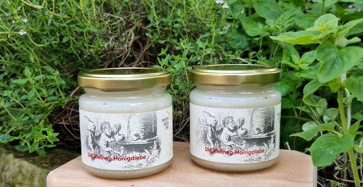 Wilhelm Busch setzt sein Wissen in mehreren Bildergeschichten und Bildromanen in Szene. Für „Die kleinen Honigdiebe“, steuerte Busch nur die Bilder bei, die Text stammt aus der Redaktion des Münchner Bilderbogen: Die Buben Peterl und Maxerl möchten süßen Honig stehlen, erhalten aber nur Stiche in Nasen und Händen. Dank dem Hobby von Marie Schuster, Mitarbeiterin der Museumslandshcaft Wilhelm Busch Wiedensahl e.V., kann Frau Schuster erfolgreich den Honig ihrer eigenen „Bienenvölkchen“ ernten, von Hand für eine cremige Konsistenz rühren und abfüllen. Der helle Frühtracht-Honig hat einen aromatischen Geschmack mit cremigem Schmelz.