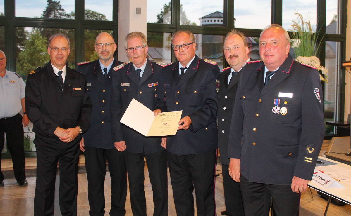 (Bad Nenndorf) In der Bad Nenndorfer Wandelhalle trafen sich am vergangenen Freitag die Vertreter der Schaumburger Feuerwehren auf Einladung des Kreisfeuerwehrverbandsvorsitzenden Klaus-Peter Grote. Vertreter des Landesfeuerwehrverbandes Niedersachsen (LFV) ehrten Grote mit der Ehrennadel in Gold.
