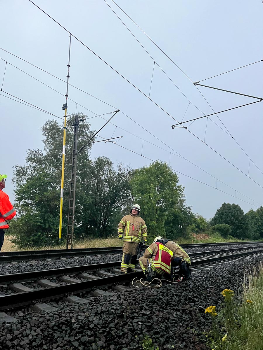 Ast gefährtet Oberleitung der Deutschen Bahn: Feuerwehr behebt Sturmschaden in Probsthagen