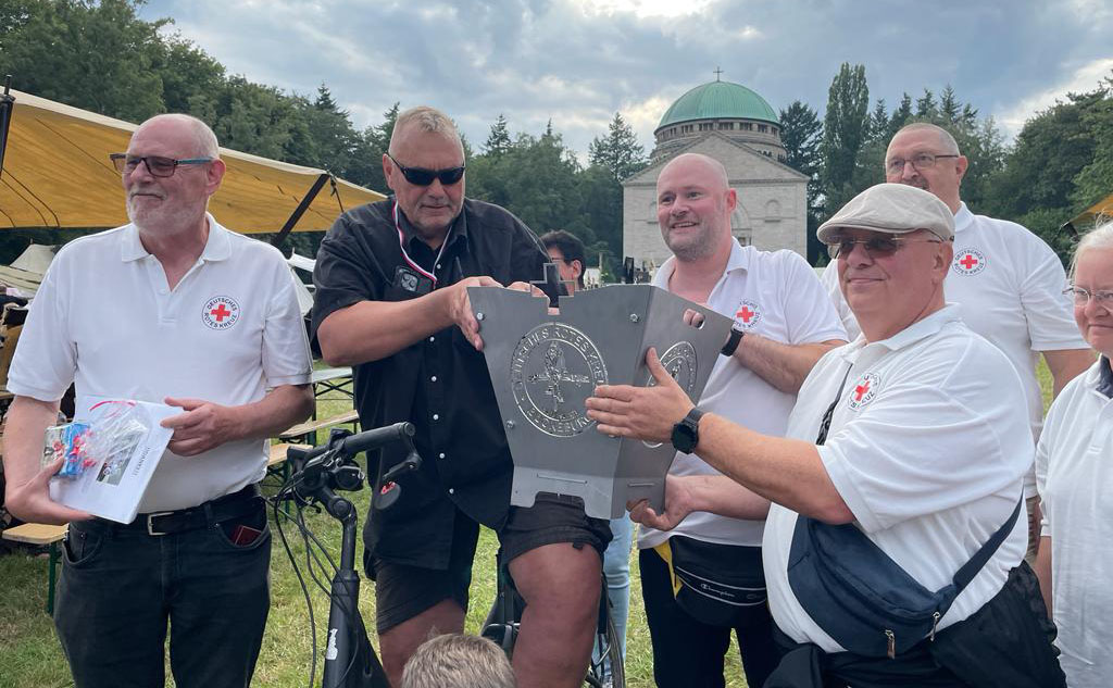 Im Rahmen einer kleinen Feierstunde überreichten der Vorstand des Ortsvereins Bückeburg, Sven Lampe, Roberto Heller und Ellen Heller, dem Veranstalter Gisbert Hiller ein besonderes Dankeschön. Als Zeichen der Anerkennung und Wertschätzung erhielt Hiller einen liebevoll gestalteten Feuerkorb, auf dem das Logo des Ortsvereins Bückeburg prangt. Zudem wurde eine Sammlung von Zeitungsartikeln überreicht, die die jahrzehntelange Arbeit der Rotkreuzler während des MPS widerspiegelt, sowie diverse weitere Erinnerungsstücke.