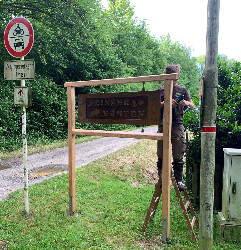 Gemeinsam mit den Mitarbeitern Sebastian Hegemann und Erich Dück wurde die erste Sitzprobe am Mittellandkanal im Meinser Kämpen bei einem kühlen Getränk aus dem Hofladen Meinsen getestet. Nicht nur die Inschrift auf den Bänken gibt den Gästen einen Hinweis in welchem Gebiet man sich befindet, sondern auch die von Firma Ralf Everding überarbeiteten und sanierten Schilder am „Meinser Kämpen“ erstrahlen wieder im neuen Glanz am Schaumburger Wald und am Kanal.