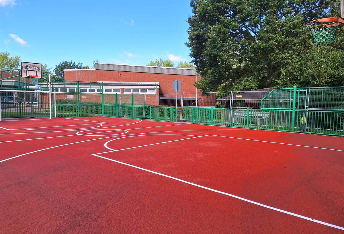 Über die diesjährigen Sommerferien erfolgte durch eine Fachfirma ein professionelles „Re-Topping“ des Kunststoffbelags. Zum Abschluss wurden jetzt die Flächenlinierungen durchgeführt.