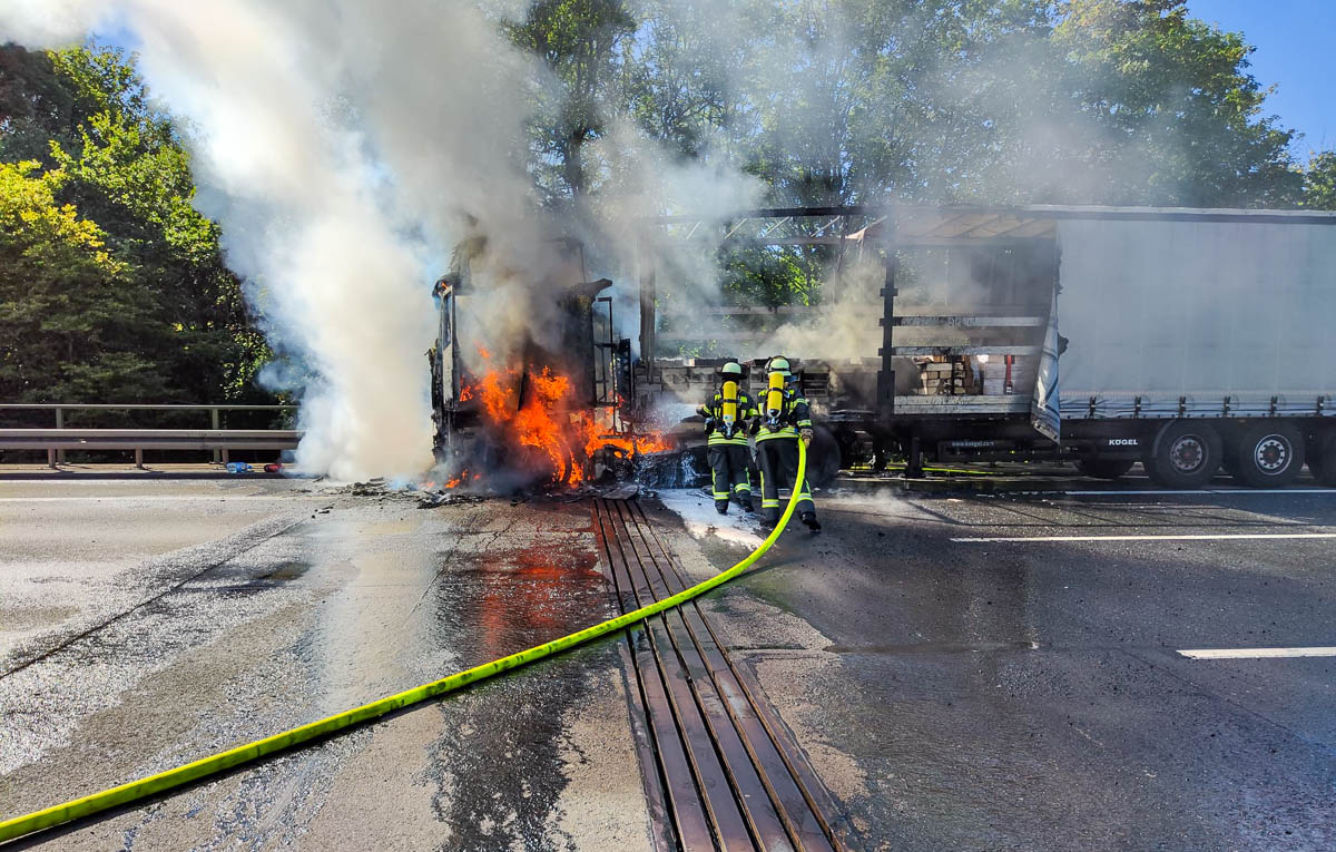 Am Einsatzort angekommen, wurde sofort begonnen, unter schwerem Atemschutz, das in Vollbrand stehende Führerhaus, sowie den mit Fliesen beladenen Auflieger zu löschen und abzukühlen.