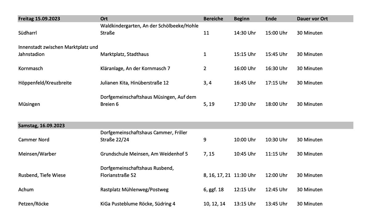 In den jeweiligen 30-minütigen Terminen können sich Bürger über den Sachstand informieren und mit den Planern ins Gespräch kommen. Die betroffenen Bereiche, Treffpunkte und Uhrzeiten sind in der nachfolgenden Grafik aufgeführt: