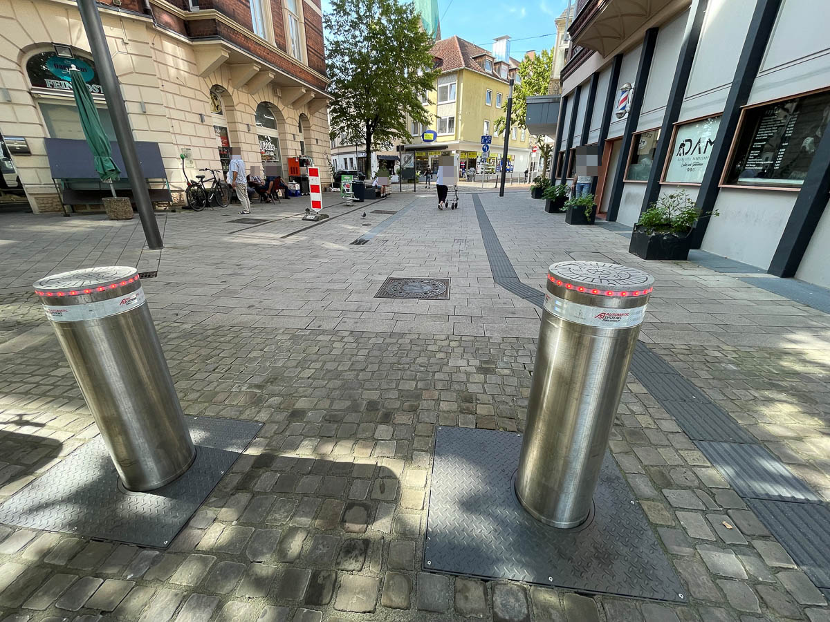 Die versenkbare Polleranlage in der Obermarktstraße (Kaak) wird für die Dauer des 1. Teilbauabschnitts außer Betrieb genommen und immer hochgefahren sein. Der Lieferverkehr für Geschäfte und Gastronomie in der Fußgängerzone muss vor der Polleranlage wenden und die Obermarktstraße zurück fahren.