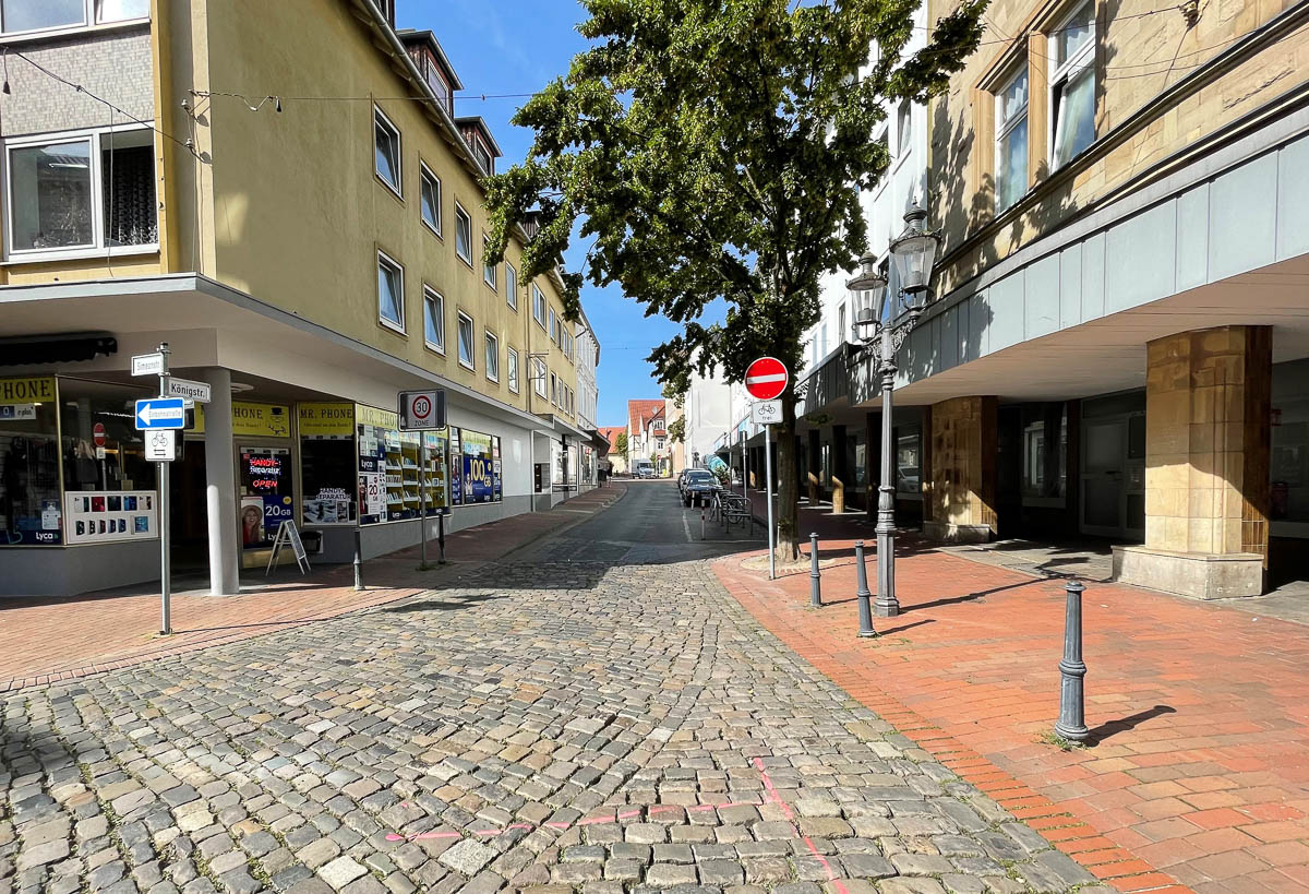 Die länger geplante Baumaßnahme soll am Montag, 20. November, beginnen. Darüber haben die Städtischen Betriebe Minden (SBM) jetzt alle Anlieger im betroffenen Abschnitt der Königstraße – zwischen Königswall und Simeonstraße – in einem Anschreiben informiert. Im Vorfeld gab es Ende August eine Informationsveranstaltung im LWL-Preußenmuseum. Die Arbeiten erfolgen unter Vollsperrung. Kraftfahrzeuge und auch Fahrräder kommen ab 20. November hier nicht mehr durch. Die nördlichen Gehwege bleiben für Fußgänger und Radfahrer schiebend passierbar.