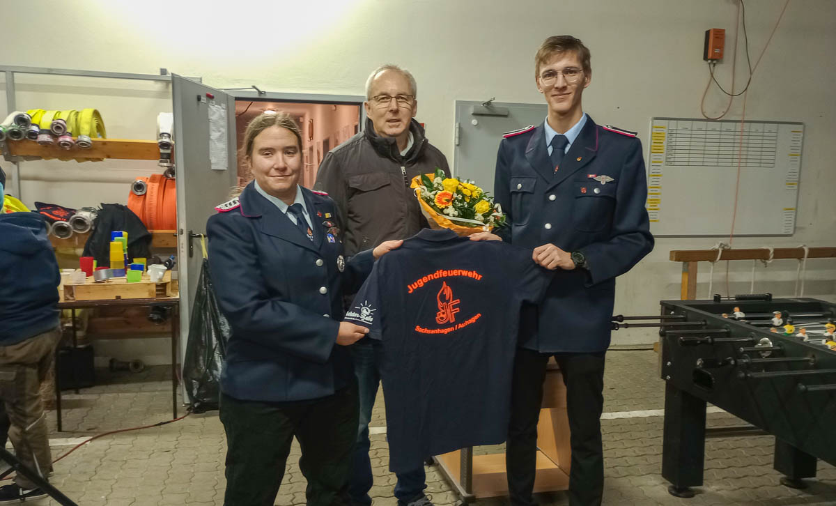 Mit Blick auf die bevorstehende Fusion der Feuerwehren Sachsenhagen und Auhagen-Düdinghausen wurde den Jugendlichen von der Firma Elektro-Rabe aus Sachsenhagen ein neuer Satz einheitlicher T-Shirts gespendet. Die Betreuer und Jugendlichen bedankten sich dafür mit einem Blumenstrauß bei Geschäftsführer Kai Buhr.