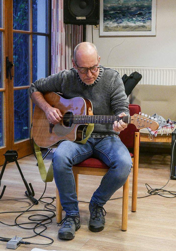 Der Gitarrist Dietmar Grunert aus Hannover konnte mit seinen bluesartigen Phrasen im gekonnten Fingerpicking-Style die Zuhörer schnell in den Bann ziehen. Seine virtuosen Eigenkompositionen fanden beim Publikum viel Beifall, sie umschlossen die thematischen Textblöcke und gaben den Zuhörern gleichzeitig die Möglichkeit, sich bei der Gitarrenmusik im Rahmen dieser Lesung zu entspannen.