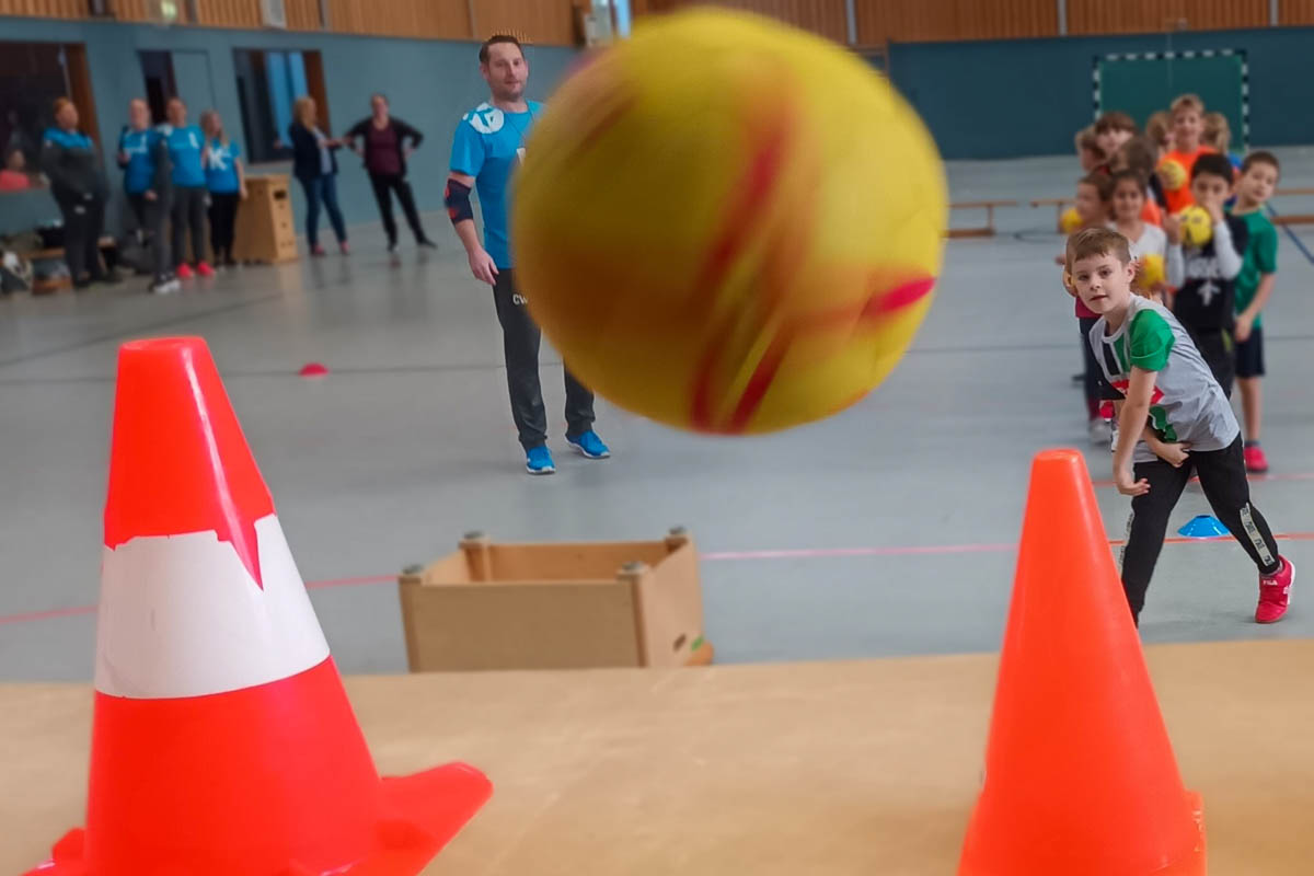 Er schnappt sich den gelb-roten Kinder-Handball und wirft ihn auf acht Hütchen, die auf einem großen Turnkasten stehen. Treffer. Drei der Kegel fliegen durch die Luft.