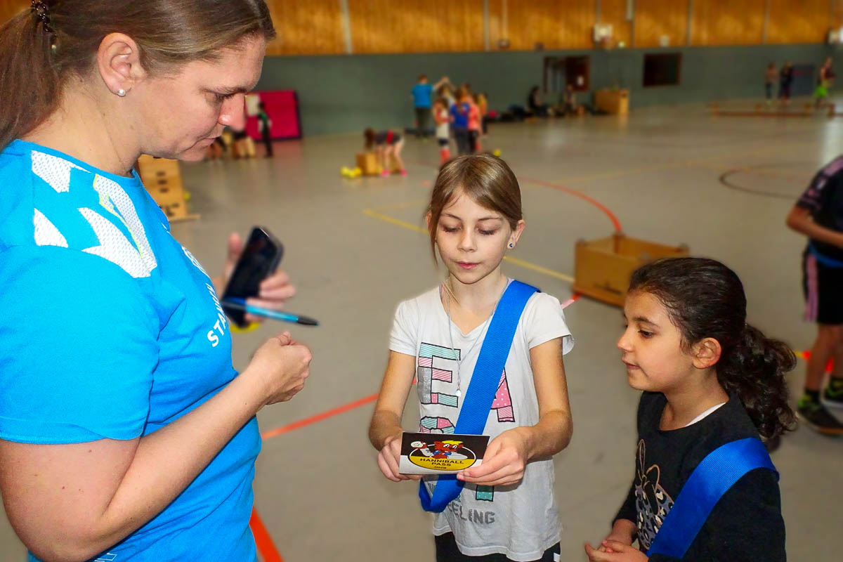 Lämmle gibt Aby (7) und Judy (8) aus der 2b den Ball für die Station „Prellen“. Und? Was macht beim Handball am meisten Spaß? „Dass man ins Tor werfen kann“, strahlt Aby. Für Judy zählt eher der Gesamteindruck: „Alles!“, sagt sie.