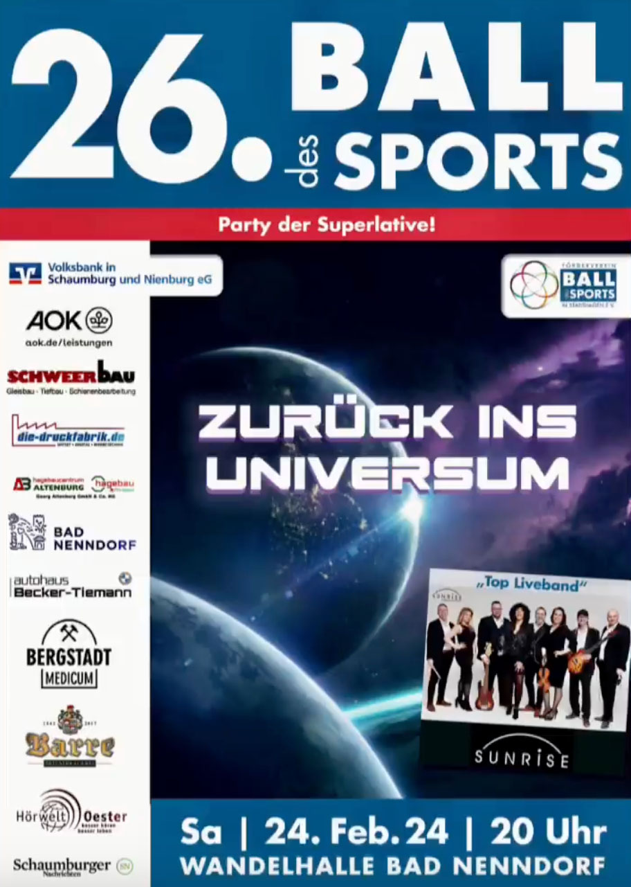 (Bad Nenndorf) Der 26. Ball des Sports steht unter dem Motto „Zurück ins Universum“. Am Samstag, 24. Februar 2024, startet die beliebte „Party der Superlative“ zum zweiten Mal Mal in der Wandelhalle Bad Nenndorf. Nach einem tollen Auftakt im letzten Jahr freuen sich alle Freunde der beliebten Veranstaltung auf eine Fortsetzung.