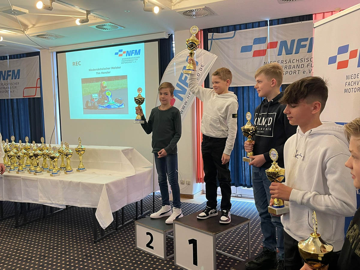 Am nächsten Tag ging es dann nach Hodenhagen, wo der Niedersächsische Fachverband für Motorsport (NFM) seine Auszeichnungen vornahm. In dieser Serie war Jamie Alexander als REC Starter unterwegs. Und in seiner ersten Saison hier kam er gleich auf Platz zwei in die NFM Wertung. Keine Selbstverständlichkeit, denn die Saison brachte auch einen Totalausfall des Karts mit sich. Das bedeutete Zeit, Kraft, Motivation und auch Geld, um ein neues Kart wieder aufzubauen.