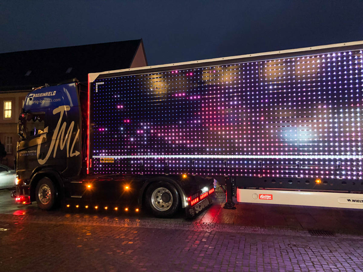 Mit großer Spannung wurde hier der X-Mas-Truck von Janina Martig Logistics erwartet. Die aus der Fernsehsendung „Trucker Babes“ bekannte Spediteurin ist derzeit in ganz Deutschland unterwegs, den blinkenden LKW voll mit Geschenken. Diese verteilt sie an tausende Kinder, gemeinsam mit heimischen Akteuren wie an diesem Abend das DRK.