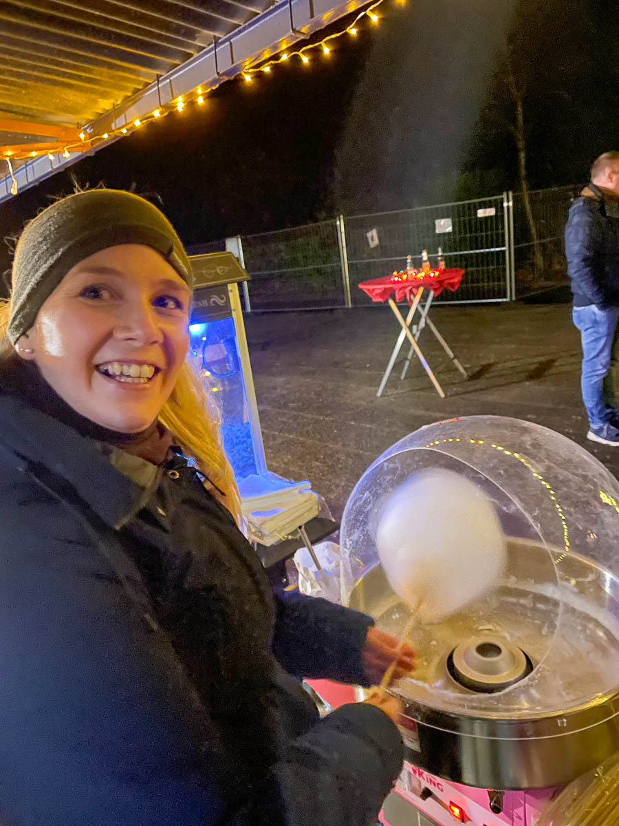 Er holt eine Stiege mit Schoko-Nikoläusen ans adventliche Licht und verteilt sie an die fleißigen Helfer. Vom Glühwein-Ausschank läuft er zum Bratwurst-Grill und an der Friteuse vorbei, taucht kurz im Nebel des Crêpes-Standes ab und versorgt am Ende auch Popcorn-Verkäufer und Zuckerwatte-Dreher.