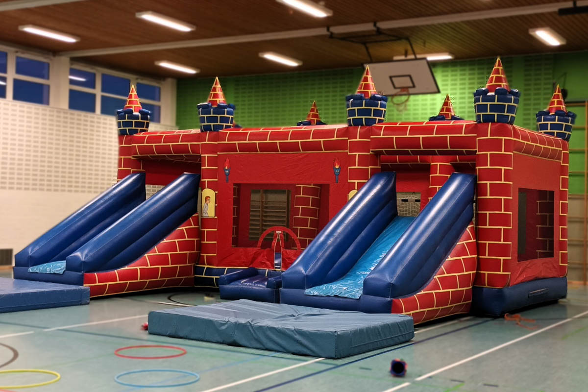 Auf wackligem Grund läuft die Truppe durch das neun Meter breite Gummi-Gemäuer, vorbei an zahlreichen sich tummelnden Jung-Handballern und -Turnerinnen. Nach abschließendem Sprung auf die Rutsche geht es vergnügt wieder vor die Tür.