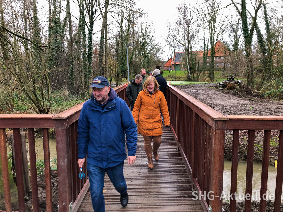 Schöniger informierte zudem, dass rund um das Brückenareal auch zeitnah Anpflanzungen zur Renaturierung erfolgen werden. Sassenberg fügte hinzu, dass auch der einzig verbleibende Wermutstropfen, der fehlende Gehweg zur Meinser Straße, bald begehbar sein wird. Bisher muss ein Provisorium reichen.