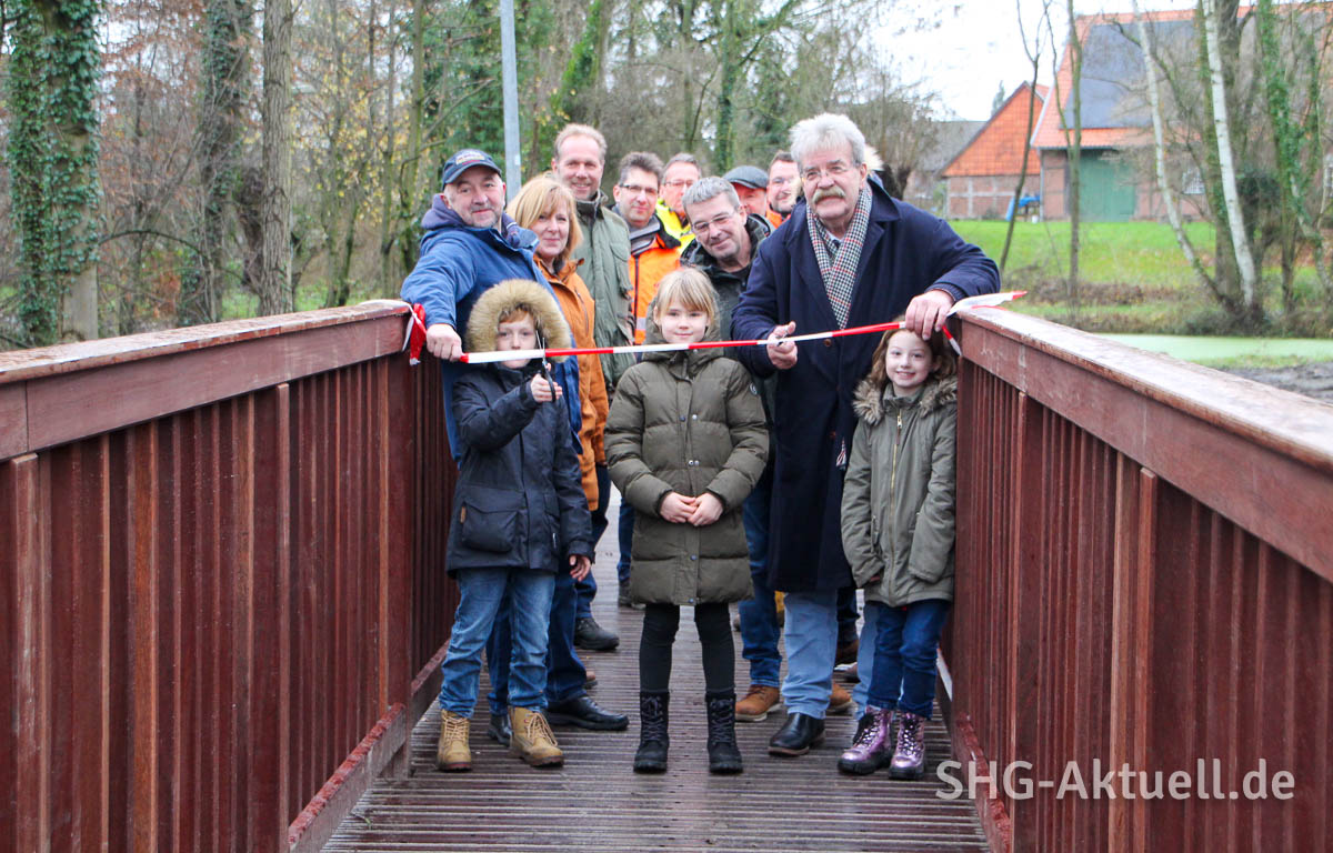 (Meinsen-Warber) 453 Tage hat es gedauert, bis wieder jemand trockenen Fußes hinter der Meinser Grundschule die Aue überqueren konnte. Am Nikolaustag war dann Bescherung angesagt: Mit einem mobilen Kran wurde die Brücke am Stück montiert, lediglich die Holzplanken und Handläufe folgten manuell. Da alle Arbeitsschritte – bis auf die Fertigstellung der Zuwegung von seitens des Dorfteiches – abgeschlossen sind, konnte die Brücke auch offiziell eröffnet werden.
