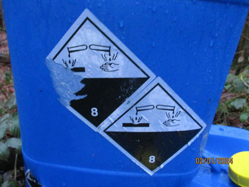 Auf den Kanistern befinden sich entsprechende Gefahrgutetiketten, die vor einem ätzenden Stoff warnen.