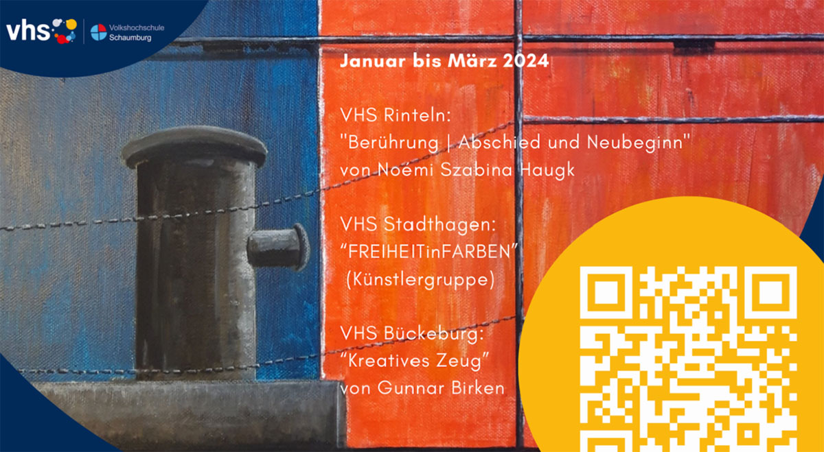 Am VHS-Standort Rinteln wird die Ausstellung unter dem Titel „Berührung. Abschied und Neubeginn von Noémi Szabina Haugk gezeigt. In der VHS Stadthagen dürfen sich die Besucher auf „FREIHEITinFARBEN“ freuen und in der VHS Bückeburg gibt es „Kreatives Zeug“ von Gunnar Birken zu sehen.