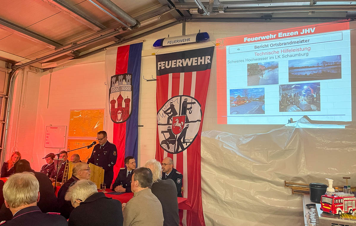 850 Einsatzstunden sind so zusammengekommen und es wurden sechs Personen aus misslichen Lagen oder aus Gefahrensituationen gerettet. 20 Brandeinsätze und 18 Technische Hilfeleistungen kamen zusammen, bei denen es unter anderem um Verkehrsunfälle mit E-Fahrzeugen, Ölschäden, Zimmerbrände oder Gebäude- und Dachstuhlbrände ging. Die Zahl der Einsätze bleibt damit auf dem hohen Level der Vorjahre. Auch an der Feuerwehr Enzen ging die Hochwasserlage am Ende des Jahres nicht vorbei. Das THW Stadthagen wurde beim Befüllen von Sandsäcken unterstützt sowie in der Samtgemeinde Nenndorf bei der Objektsicherung. Fischer blickte positiv in die Zukunft: Es wird ein weiteres Löschfahrzeug für die Ortsfeuerwehr geben sowie einen neuen Mannschaftstransportwagen.