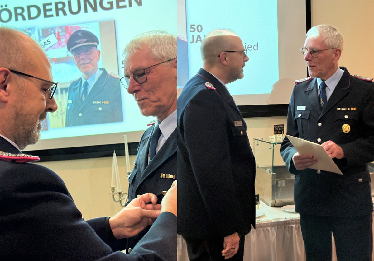 Andreas Tadge wurde für seine 50-jährige aktive Dienstzeit geehrt und bekam das Niedersächsische Feuerwehr-Ehrenzeichen des Innenministeriums durch Joachim Muth, Abschnittleiter Nord der Kreisfeuerwehr, verliehen. Andreas Tadge hat sich neben dem langjährigem Feuerwehrdienst auch besonders in der Brandschutzerziehung und der Nachwuchsförderung aktiv eingebracht.