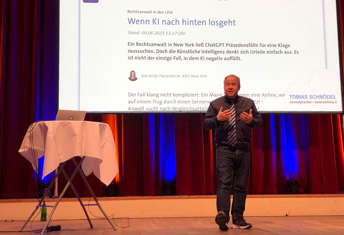 Vor allen Dingen in Unternehmen sei es daher wichtig zu überlegen, mit welchen Informationen eine KI gefüttert wird – sie wird diese nämlich ohne schlechtes Gewissen beim nächsten, der fragt, ausplaudern. „Mein Fazit: Schauen Sie, mit welchen Daten sie die KI trainieren und denken Sie gründlich nach bei der Nutzung“, gibt Schrödel den Anwesenden zum Ende seines Vortrages mit auf den Weg. (Text & Foto: nh)