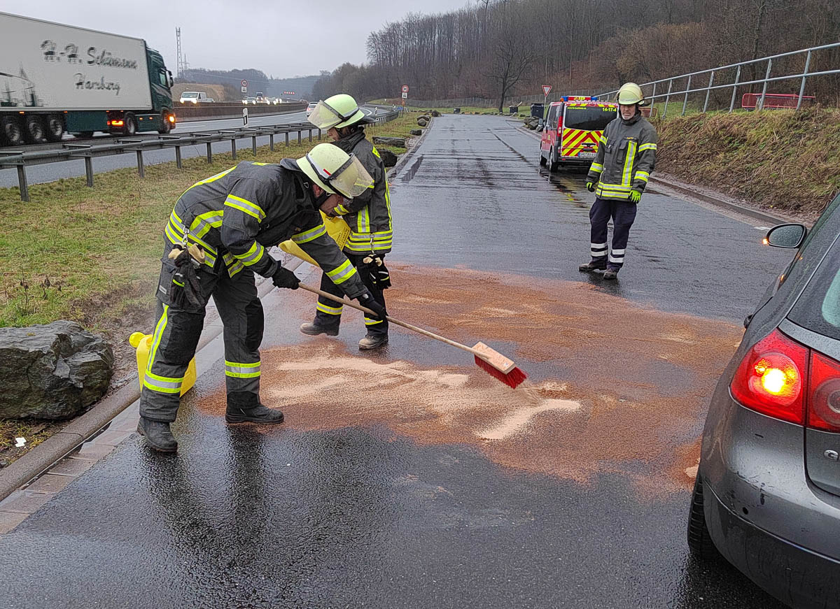 Nach rund anderthalb Stunden konnte die Einsatzstelle an die Autobahnmeisterei übergeben werden, um den Parkplatz sowie die angrenzenden Betriebsflächen gründlich zu reinigen. Für die Dauer des Einsatzes war der Rastplatz Bernser Kirchweg, die Auffahrt, sowie die rechte Autobahnspur vollständig für den Verkehr gesperrt. Es kam zu Behinderungen. (pr/Fotos: pr)
