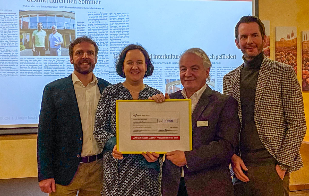 Ute Urselmann und Moreno Ciotti nahmen den „Länger besser leben.“-Preis 2023 für die Volkshochschule Schaumburg (VHS) entgegen. Die recht spontan entstandene Kooperationsidee von Sommerkursen für Bewegungsangebote und Entspannungstechniken setzte die VHS trotz Organisationserschwernissen während der Sommerferien um. Alle Kurse seien so schnell ausgebucht gewesen, dass sie kurzfristig sogar noch aufgestockt worden seien, berichtete Ciotti. Der „Länger besser leben.“-Preis ist mit 1500 Euro dotiert und wird jährlich an einen besonders engagierten Partner vergeben. (pr/Foto: pr)