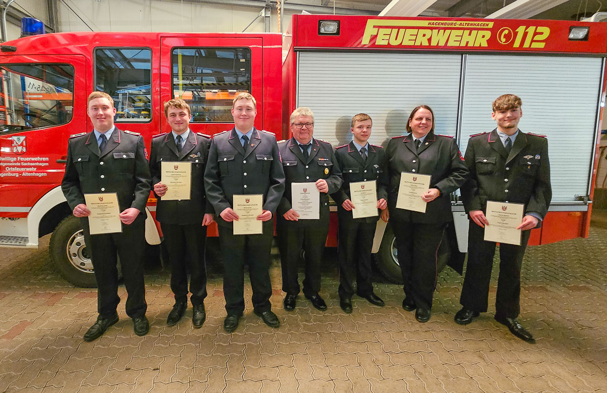 Insgesamt hat die Feuerwehr Hagenburg/Altenhagen 437 Mitglieder, von denen 34 aktiv sind. Von den aktiven Kameraden wurden 2023 insgesamt 12 Lehrgänge auf Kreis- und Landesebene besucht. Eine besondere Ehrung gab es für Uwe Niemeyer. Er wurde von Gemeindebrandmeister Ralf Hermann für 50 jährige Mitgliedschaft mit dem niedersächsischen Feuerwehr-Ehrenzeichen, ausgezeichnet. Peter Rakelbusch und Klaus Riekemann erhielten eine Ehrung für 50-jährige, fördernde Mitgliedschaft. Maya Bruns wurde zur Feuerwehrfrau befördert. Felix Wiebe und Domenik Mathias sind jetzt Feuerwehrmänner, Leandro Wulferding Oberfeuerwehrmann und Maximilian und Michael Schaer Hauptfeuerwehrmann. Kathrin Rose wurde zur Löschmeisterin befördert.