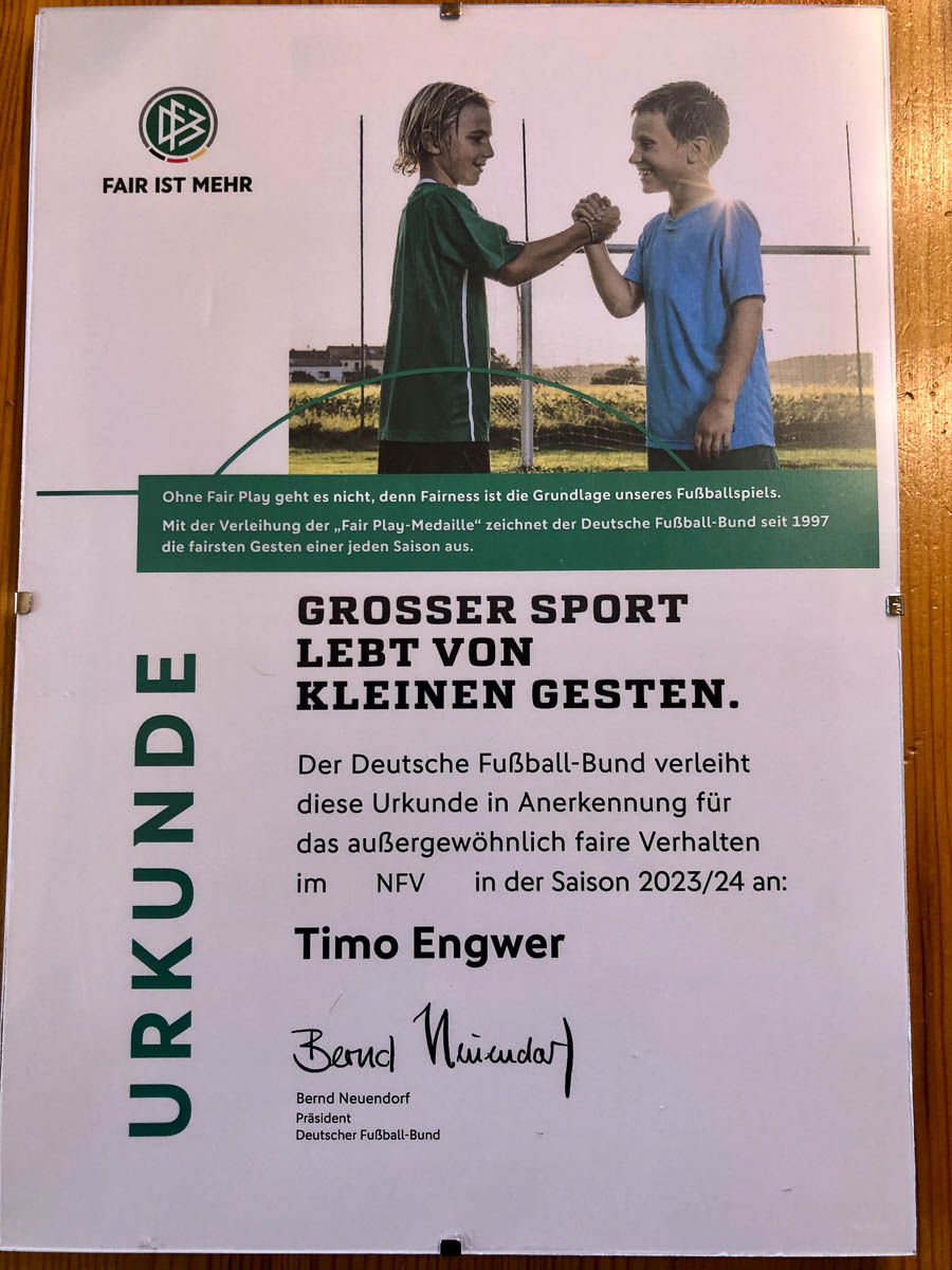 Schiedsrichter Lennard Braun-Werdin konnte dabei nicht erkennen, ob der Ball vollumfänglich die Torlinie passiert hatte. Spieler Engwer signalisierte sofort, dass der Ball zum vorentscheidenden 4:2 im Tor war. Braun meldete die Fair-Play-Aktion an den NFV.