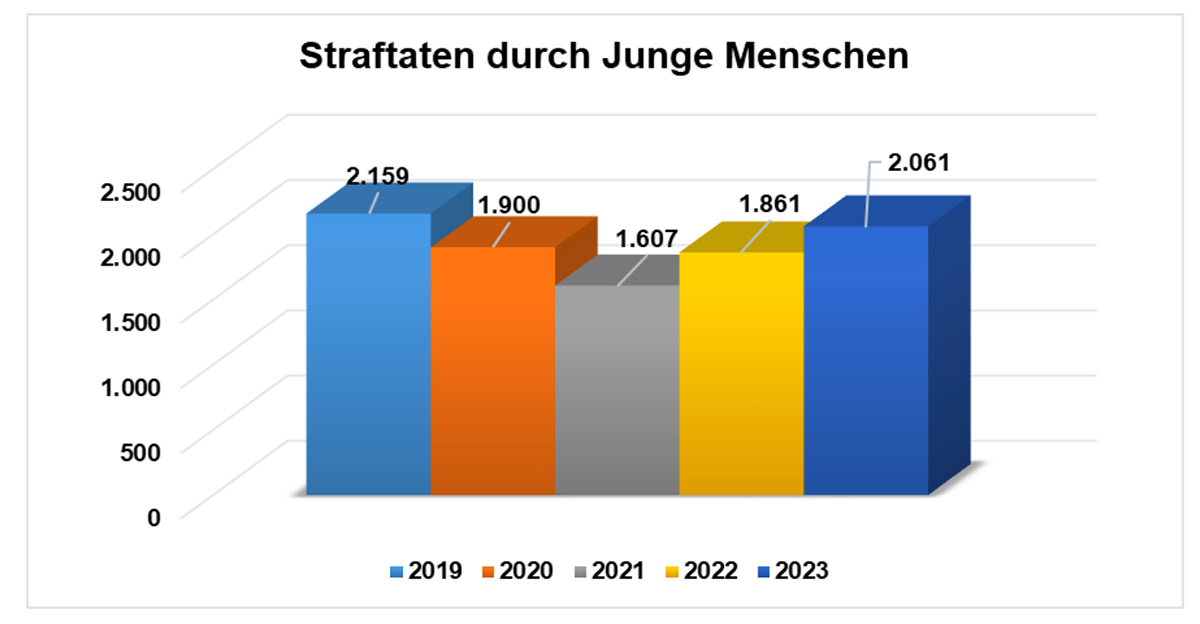 Im Jahr 2022 machten junge Tatverdächtige 25 Prozent aller Tatverdächtigen aus. Im Jahr 2023 stieg diese Zahl auf 26,37 Prozent. Der stärkste Anstieg ist wie auch schon im Vorjahr bei den tatverdächtigen Kindern mit 61,08 Prozent zu finden. (2022: +51,14%) Als Tatverdächtige wurden 385 Kinder im Alter von 0-14 Jahren (2022: 289), 746 Jugendliche im Alter von 14-18 Jahren (2022: 681) sowie 595 Heranwachsende zwischen 18 und 21 (2022: 586) und 6.091 Erwachsene über 21 Jahre (2022: 5.886) ermittelt. Auch die Straftaten im Schulkontext sind im Vergleich zum Vorjahr leicht angestiegen. Im Jahr 2022 wurden 114 Straftaten mit Schulkontext bekannt, in diesem Jahr sind es 148. Dies bedeutet eine Steigung von 29,82 Prozent.